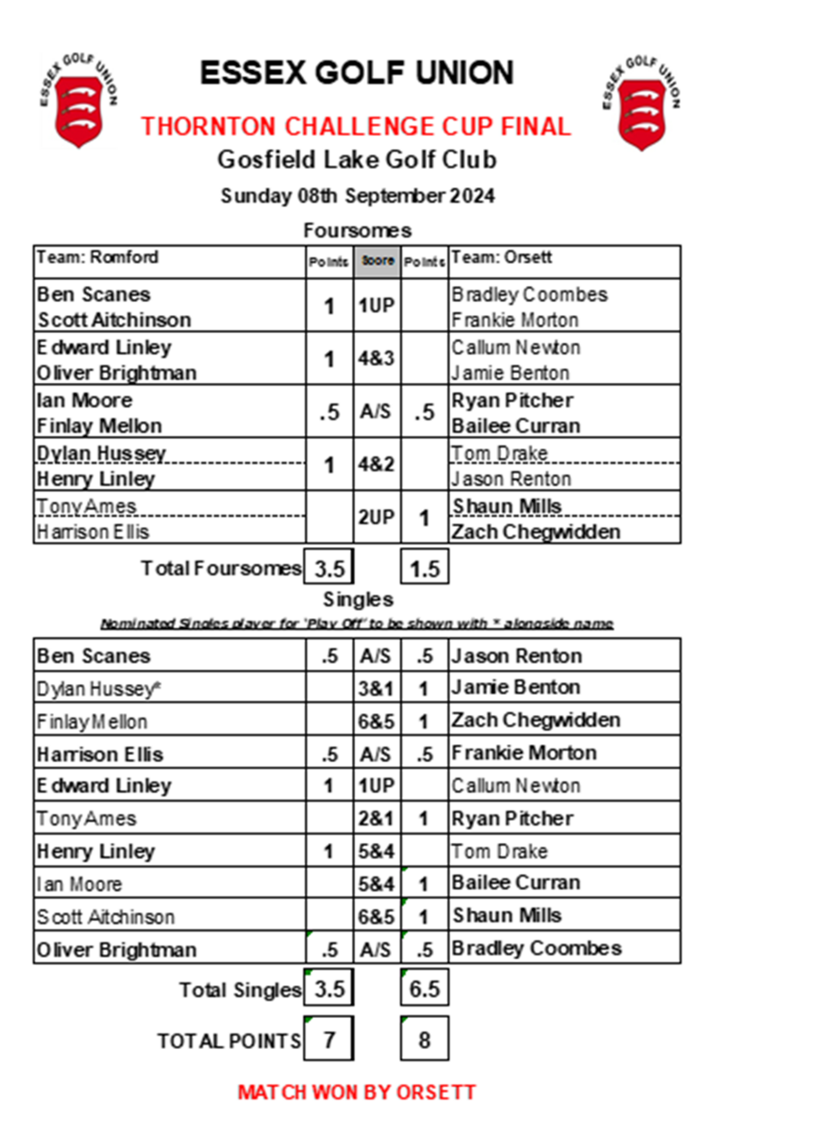 Romford GC came out strong in the morning Foursomes, winning all but 1 match, this put them in the early lead 3½ to 1½, going into the afternoon singles matches with what was a clear advantage on the defending champions Orsett, will they go on to win the Thorton Challenge Cup 2024? There was an eager and somewhat anxious wait to see how the afternoon matches would unfold.After lunch there were some heavy showers, and the temperature dropped slightly from the morning. The pendulum swung in Orsett's favour, and they had 4 points after the first 6 singles matches. Romford managed good wins from Edward Linley and Henry Linley. However, with clear wins by Jamie Benton, Zach Chegwidden, Ryan Pitcher, Bailee Curran and Shaun Mills Orsett won the singles 6½ - 3½ and went on to retain the Thornton Challenge Cup with a final result of 8 - 7 well done to them for retaining the for another year!