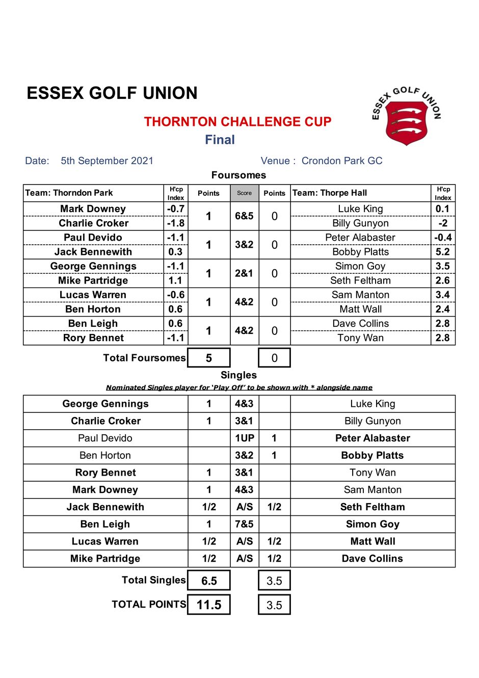 Thorndon Park's play-off man George Gennings led their afternoon charge in the singles with a 4&3 win over Thorpe Hall's Luke King. The second match out was the battle of the youngsters and once Charlie Croker had got the better of Billy Gunyon by 3&1 it was going to take some kind of miracle for Thorpe Hall to snatch the trophy away from Thorndon Park. Thornton Cup veterans Pete Alabaster and Bobby Platts gave Thorpe Hall a measure of relief with victories over their Thorndon opponents, but Mark Downey sealed Thorndon Park's victory at the dog-legged 15th hole with a 4&3 win over Sam Manton.
