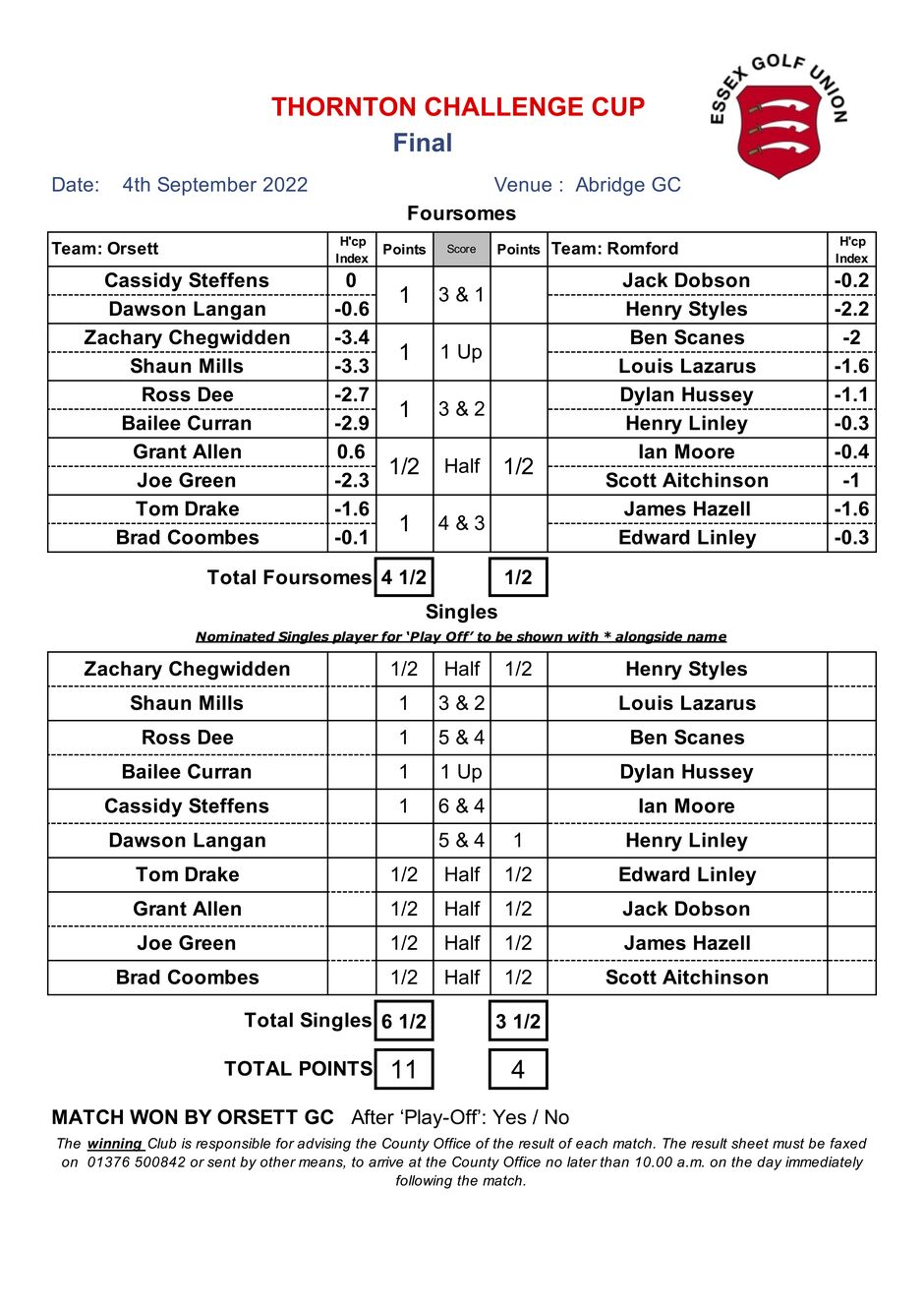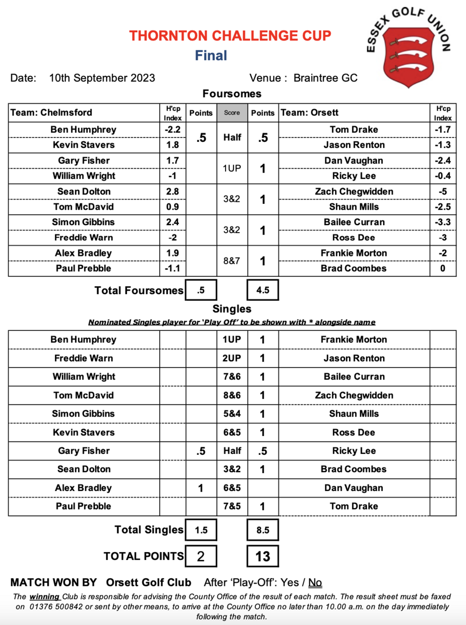 Orsett's strength in depth was evident in the morning matches, securing a 4½ to ½ point lead at lunch. This only left Orsett requiring 3½ points from the afternoons matches to secure the Thornton Challenge Cup for the second year in a row.